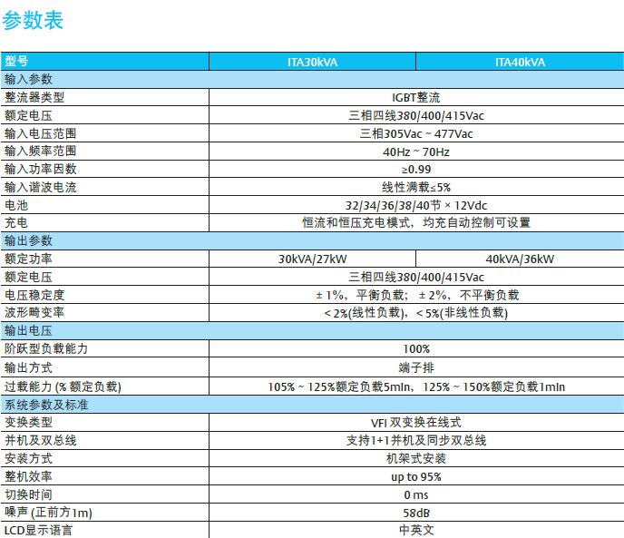 ITA系列30/40kVA是全球最节省占地面积的系统;在一个标准机柜中可以安装完整的一套并机或双总线系统,包含2台UPS的输入配电、维修旁路、2台UPS主机和18~36路负载分支配电。